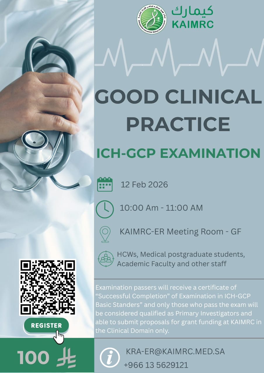 Examination passers will receive a certificate of “Successful Completion” of Examination in ICH-GCP Basic Standers” and only those who pass the exam will be considered qualified as Primary Investigators and able to submit proposals for grant funding at KAIMRC in the Clinical Domain only.